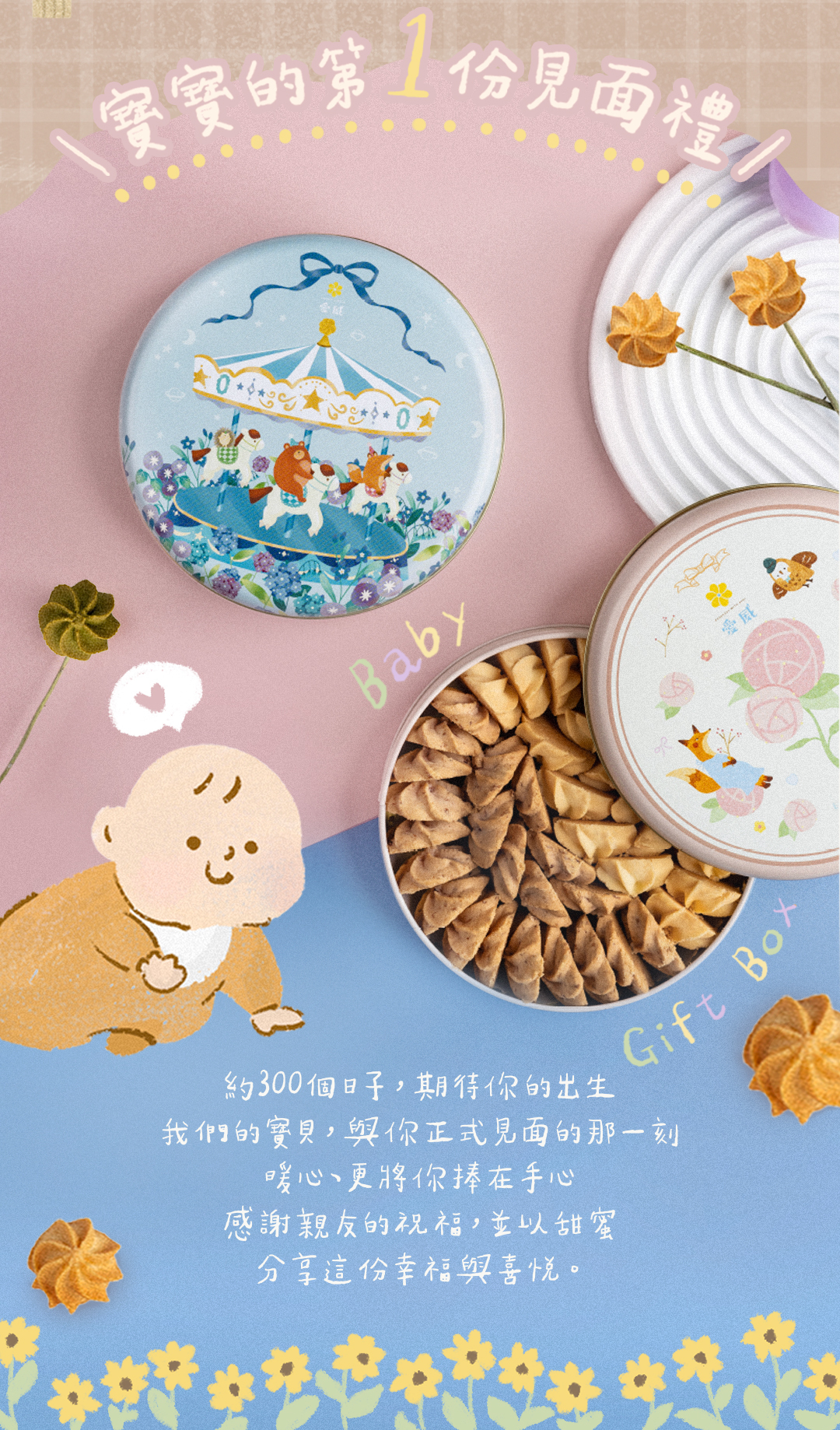 約300個日子,期待你的出生,我們的寶貝,與你正式見面的那一刻,暖心、更將你捧在手心,感謝親友的祝福,並以甜蜜分享這份幸福與喜悅。